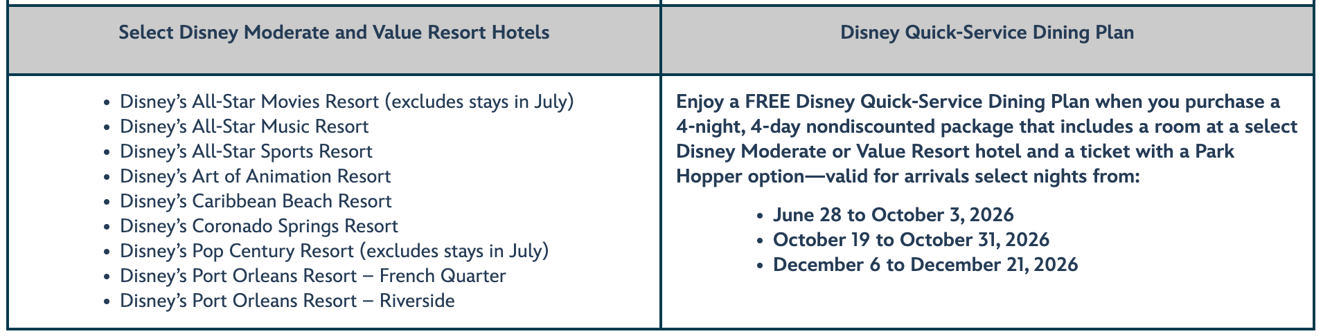- The dining plan included in this special offer depends on the Disney Resort hotel you select. The Disney Dining Plan is included when you choose a stay at a Disney Deluxe or Disney Deluxe Villa Resort hotel. The Disney Quick-Service Dining Plan is included when you choose a stay at a Disney Moderate or Disney Value Resort hotel.