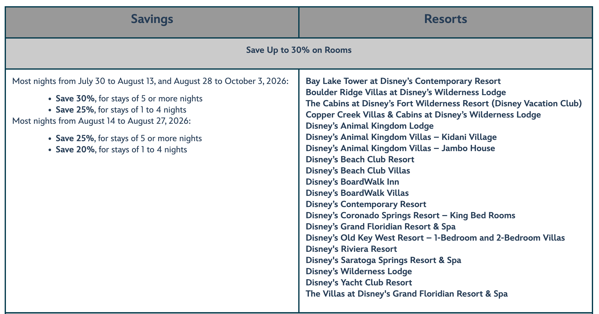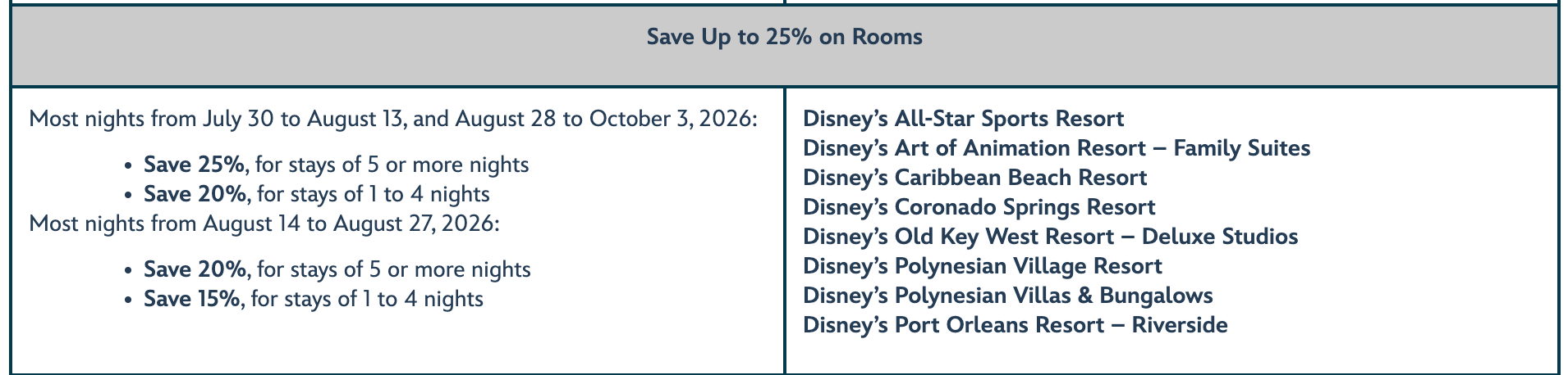 This offer is valid for the Disney Resorts Collection hotels listed below. View the chart to explore savings.