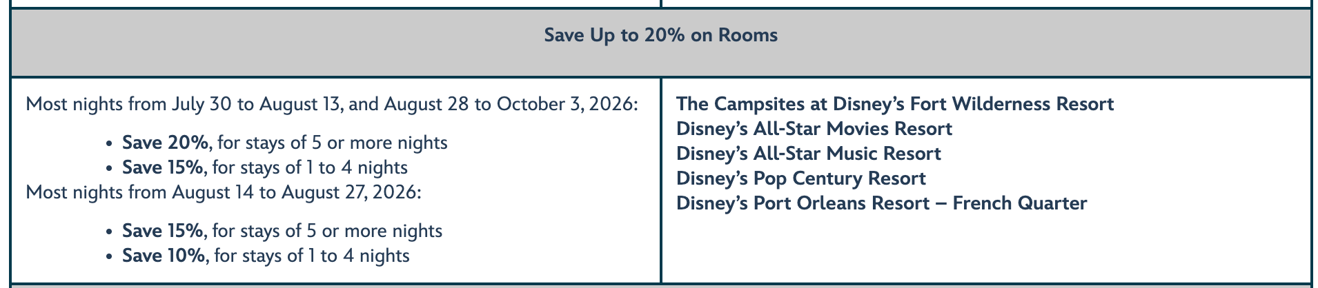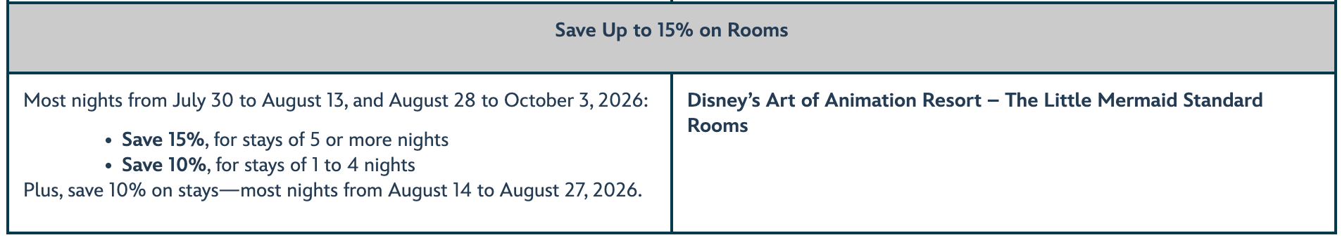 - Offer excludes the following room types: 3-Bedroom Grand Villas; Campsites; Cabins at Copper Creek Villas & Cabins at Disney’s Wilderness Lodge; Bungalows and Penthouses at Disney’s Polynesian Villas & Bungalows; The Little Mermaid Standard Rooms at Disney’s Art of Animation Resort; and Suites at Disney Moderate and Disney Deluxe Resort hotels.